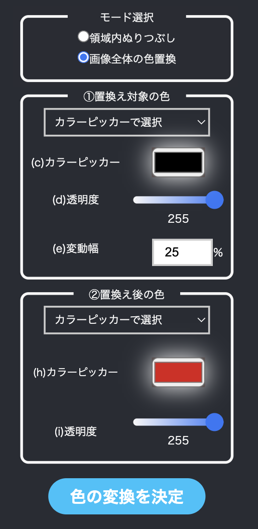 (c)カラーピッカー | 置換え対象とする色をカラーピッカーで選択できる。 (e)変動幅が0%の場合、RGBAが完全一致しないと色変換は実行されないので(a)スポイトの使用を推奨。 |