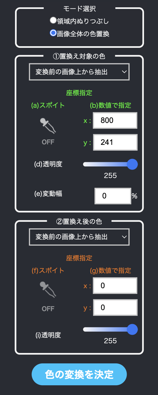 ①置換え対象の色 | 変換前の画像上から抽出 | プルダウンメニュー。置換え対象の色の指定方法を座標指定からカラーピッカー指定へ変更できる。 |