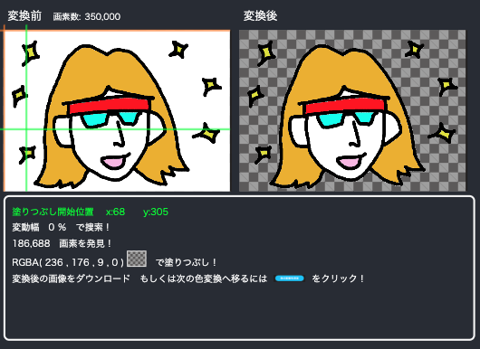 変換前(画像) | 変換前の画像、スポイト機能や塗りつぶし機能で座標指定を行う。 ここに表示中の画像がダウンロードできる。 |