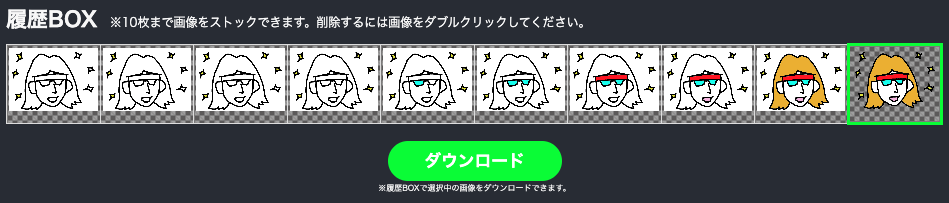 履歴BOX | 選択中(緑色太枠内)の画像が変換前へ表示される。 選択中(緑色太枠内)の画像がダウンロードボタンからダウンロードできる。 履歴BOXには10枚まで画像を保存できる。 10枚を超えた場合、古い画像から自動的に削除される。 任意に削除するには画像をダブルクリックする。 |