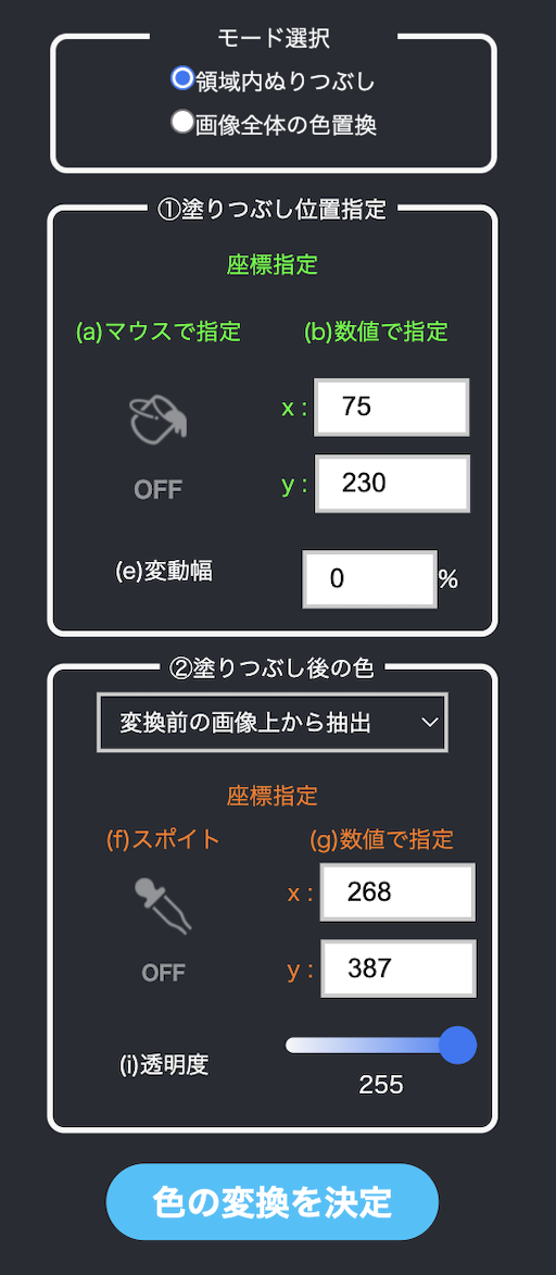 ①塗りつぶし位置指定 | (a)マウスで指定 | ONにした状態でマウスカーソルを変換前の画像上へ移動すると、塗りつぶし開始位置を選択できる。 |